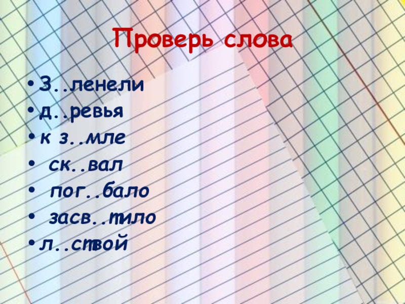Проверь словаЗ..ленелид..ревьяк з..мле ск..вал пог..бало засв..тилол..ствой