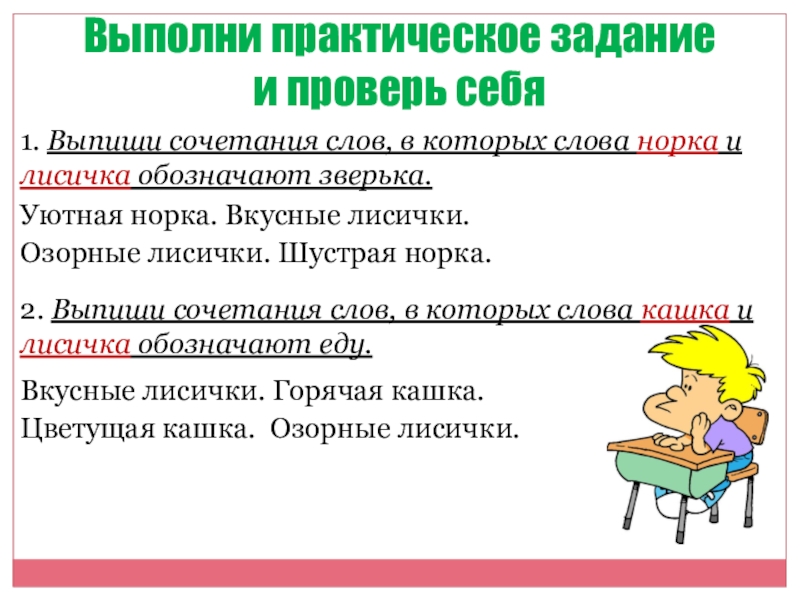 2. Выпиши сочетания слов, в которых слова кашка и лисичка обозначают еду.