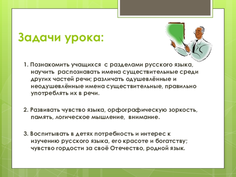 1. Познакомить учащихся с разделами русского языка, научить распознавать имена