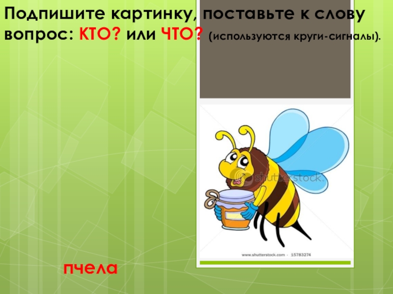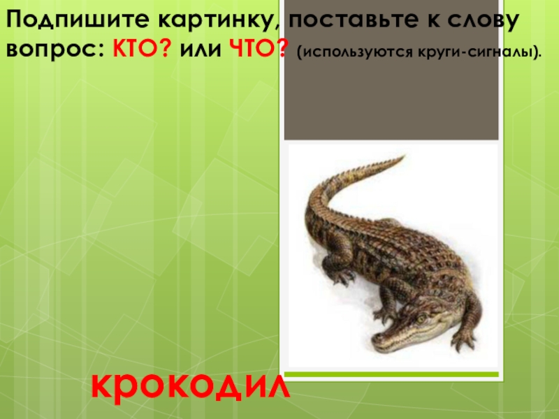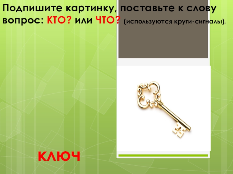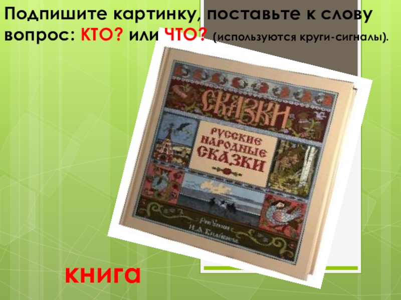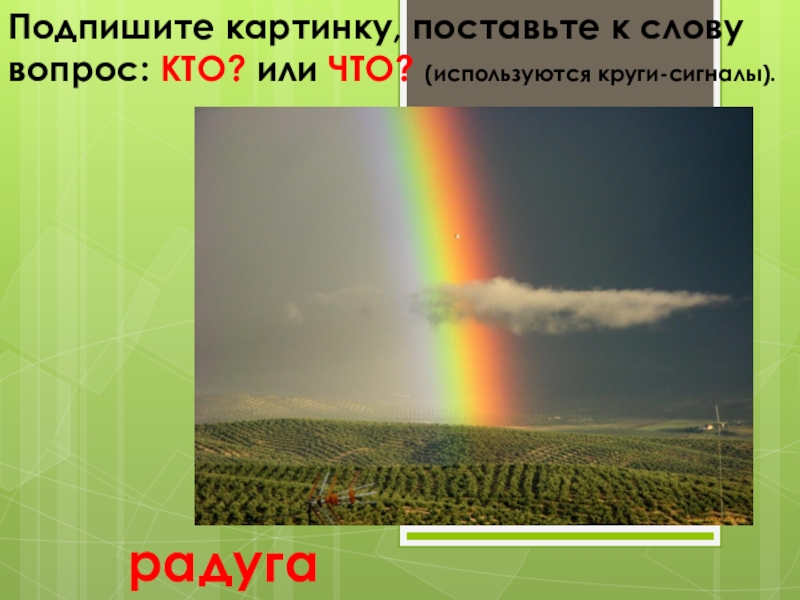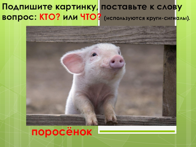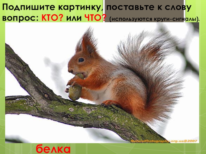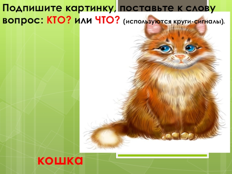 Слайд 13Подпишите картинку, поставьте к слову вопрос: КТО? или ЧТО? (используются круги-сигналы).