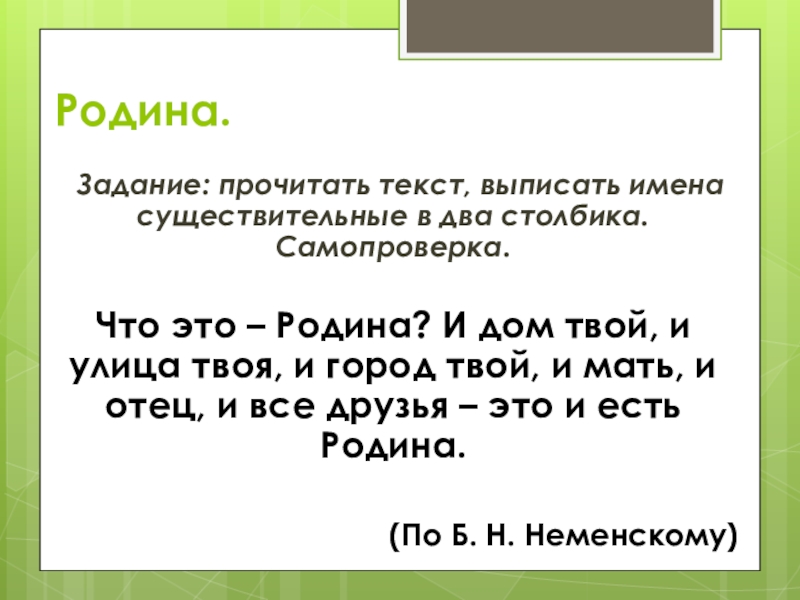 Задание: прочитать текст, выписать имена существительные в два столбика. Самопроверка.