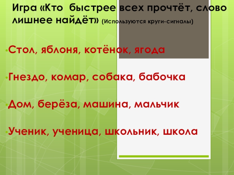 Слайд 22Игра «Кто быстрее всех прочтёт, слово лишнее найдёт» (Используются круги-сигналы)
