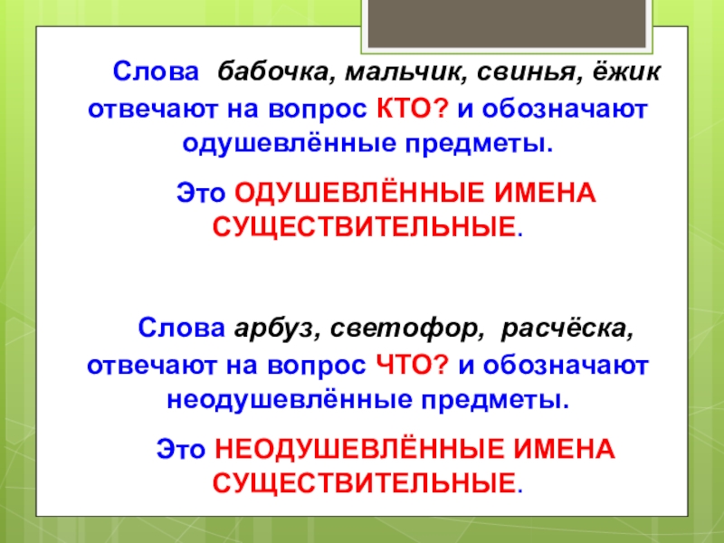 Слова бабочка, мальчик, свинья, ёжик отвечают на вопрос КТО? и обозначают одушевлённые предметы.