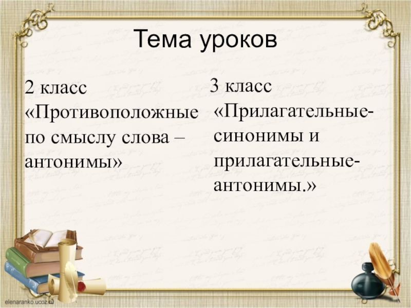 Тема уроков2 класс «Противоположные по смыслу слова – антонимы»3 класс «Прилагательные-синонимы и прилагательные- антонимы.»