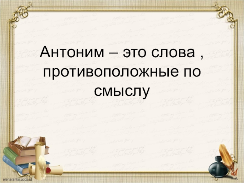 Слайд 5 Антоним – это слова , противоположные по смыслу