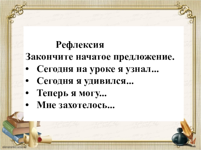 РефлексияЗакончите начатое предложение.•  Сегодня на уроке я узнал...•  Сегодня