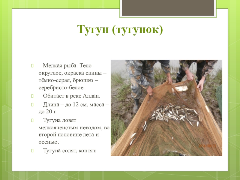 Тугуна ловят мелкоячеистым неводом, во второй половине лета и осенью.