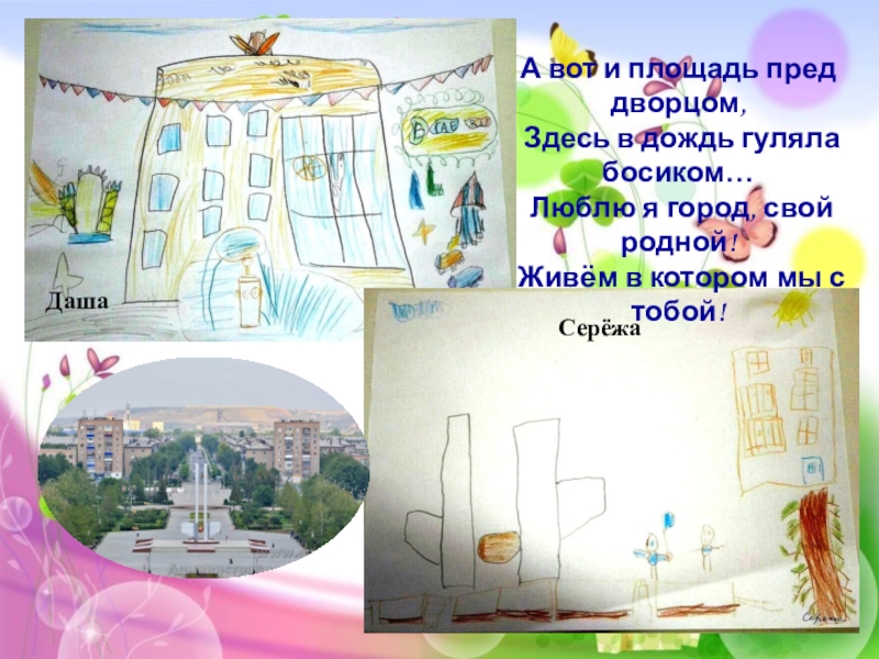 ДашаСерёжаА вот и площадь пред дворцом,  Здесь в дождь гуляла босиком…  Люблю я город, свой родной!  Живём