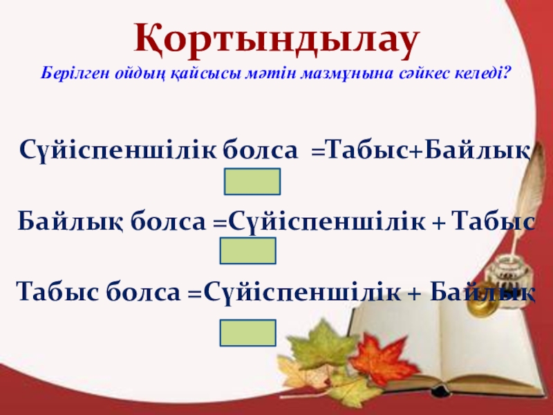 ҚортындылауБерілген ойдың қайсысы мәтін мазмұнына сәйкес келеді?Сүйіспеншілік болса =Табыс+БайлықБайлық болса =Сүйіспеншілік + Табыс Табыс болса =Сүйіспеншілік +