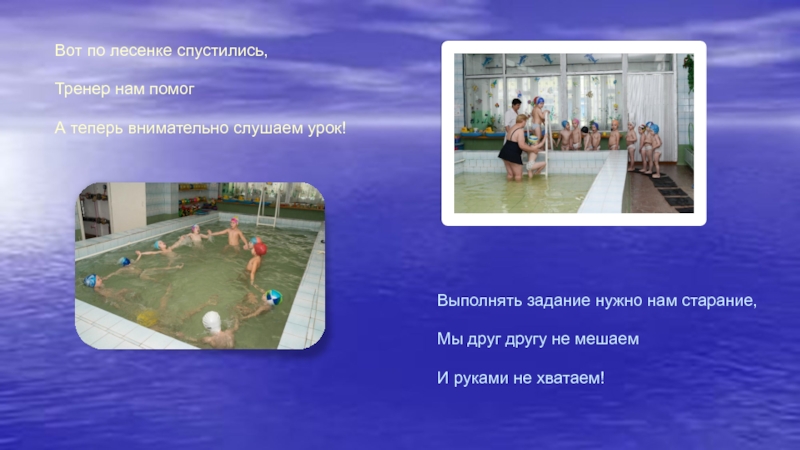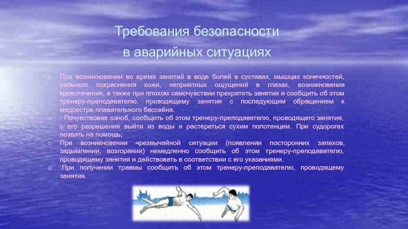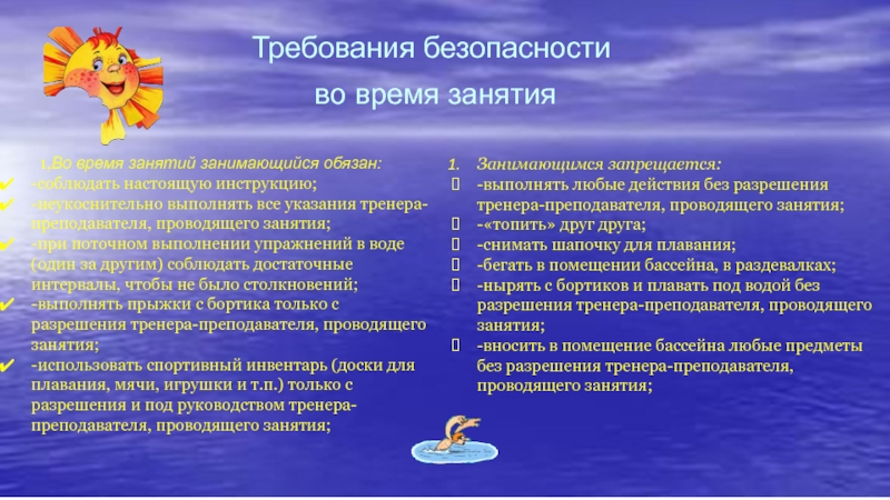 -нырять с бортиков и плавать под водой без разрешения тренера-преподавателя, проводящего занятия;