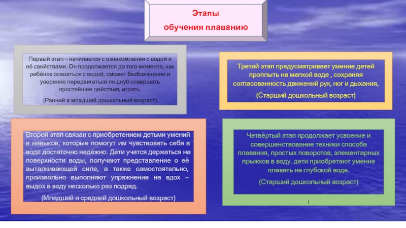 Четвёртый этап продолжает усвоение и совершенствование техники способа плавания, простых поворотов, элементарных прыжков в воду. дети приобретают умение плавать на глубокой воде.