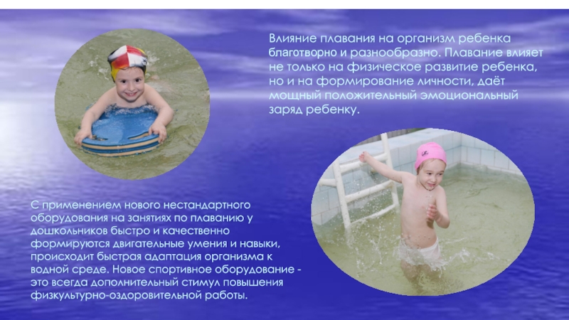 С применением нового нестандартного оборудования на занятиях по плаванию у дошкольников быстро и качественно формируются двигательные умения и навыки, происходит быстрая адаптация организма к водной среде. Новое спортивное оборудование - это всегда дополнительный стимул повышения физкультурно-оздоровительной работы.