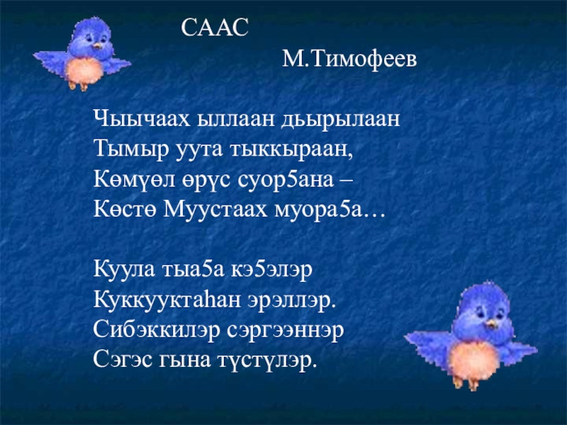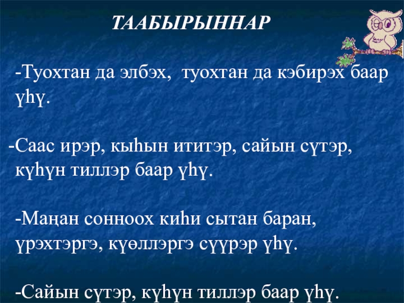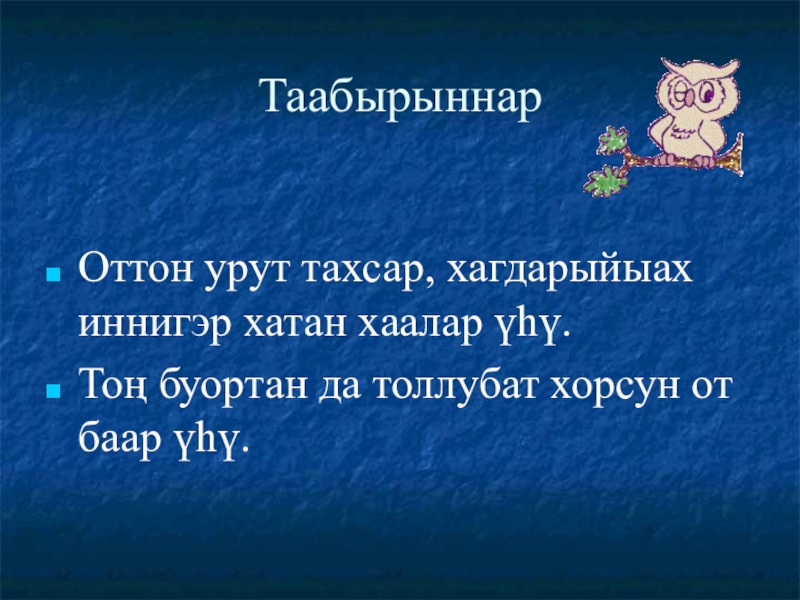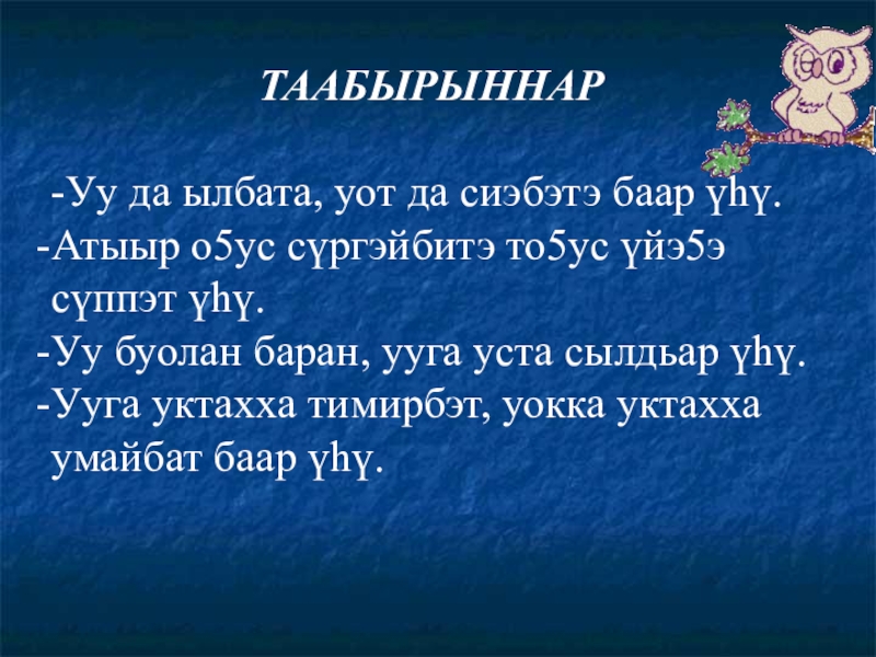 Слайд 3Уу-хаар, чалбах тахсар, бадараан бө5ө буолар, ол эрээри түүн тоңорор. Бу