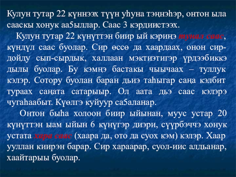 Слайд 2Кулун тутар 22 күннээх түүн уһуна тэңнэһэр, онтон ыла сааскы хонук