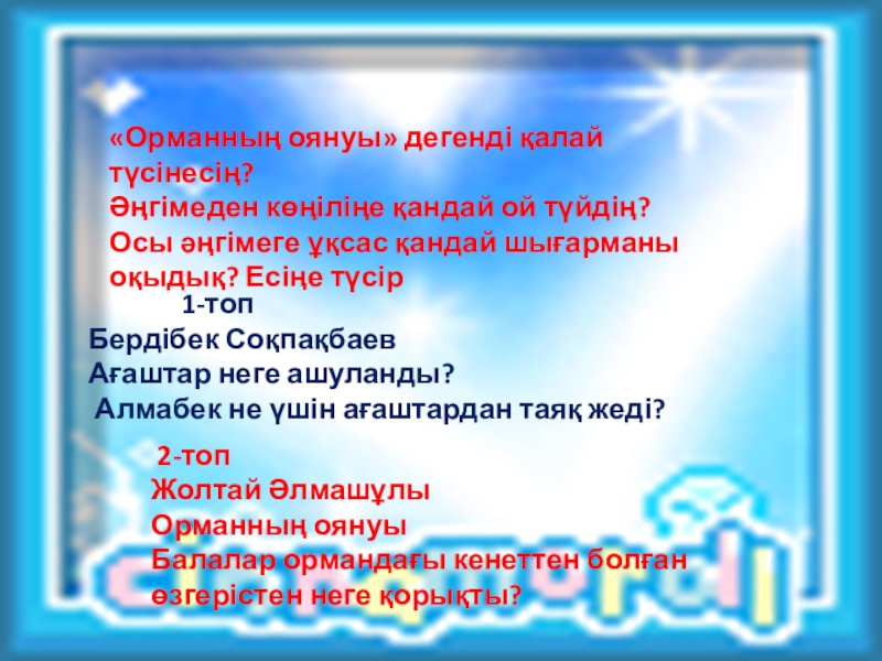 Әр топ мәтін бойынша 5 сұрақтан дайындайды