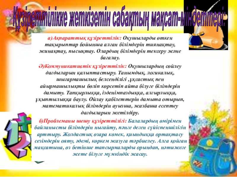 Құзіреттілікке жеткізетін сабақтың мақсат-міндеттері: