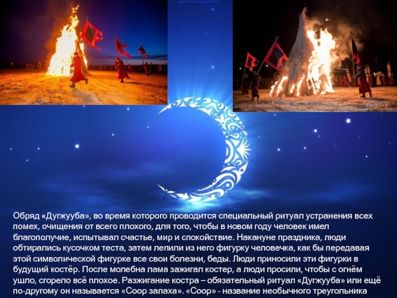 очищения от всего плохого, для того, чтобы в новом году человек имел благополучие, испытывал счастье, мир и спокойствие. Накануне праздника, люди обтирались кусочком теста, затем лепили из него фигурку человечка, как бы передавая этой символической фигурке все свои болезни, беды. Люди приносили эти фигурки в будущий костёр. После молебна лама зажигал костер, а люди просили, чтобы с огнём ушло, сгорело всё плохое. Разжигание костра – обязательный ритуал «Дугжууба» или ещё по-другому он называется «Соор залаха». «Соор» - название необычного треугольника пирамидального сооружения, украшенного языками пламени.