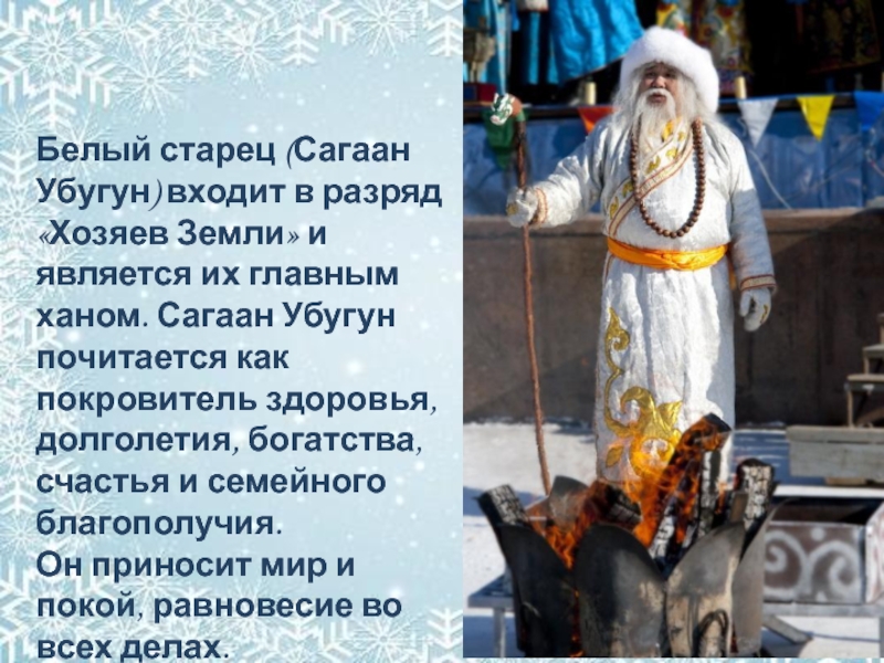 Слайд 7Белый старец (Сагаан Убугун) входит в разряд «Хозяев Земли» и является