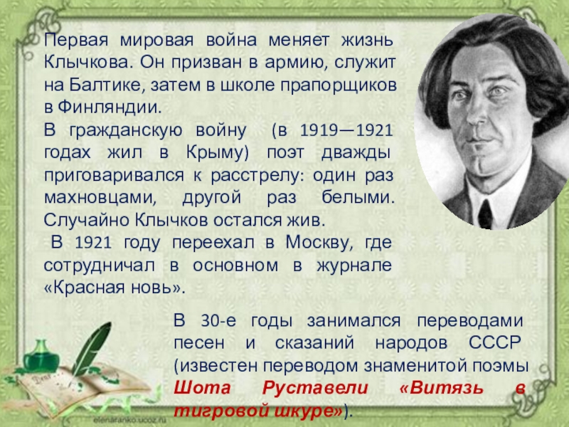 В 30-е годы занимался переводами песен и сказаний народов СССР (известен переводом знаменитой поэмы Шота Руставели «Витязь в тигровой шкуре»).
