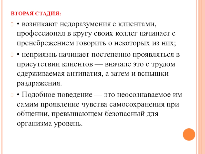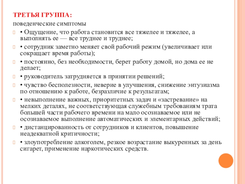 • дистанцированность от сотрудников и клиентов, повышение неадекватной критичности;