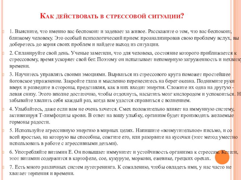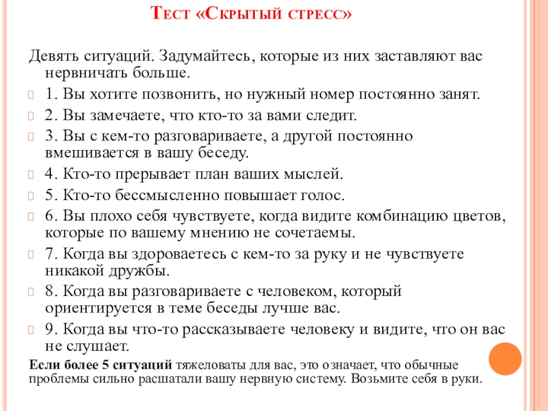 Если более 5 ситуаций тяжеловаты для вас, это означает, что обычные проблемы сильно расшатали вашу нервную систему. Возьмите себя в руки.