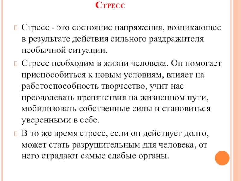 Стресс - это состояние напряжения, возникающее в результате действия сильного раздражителя