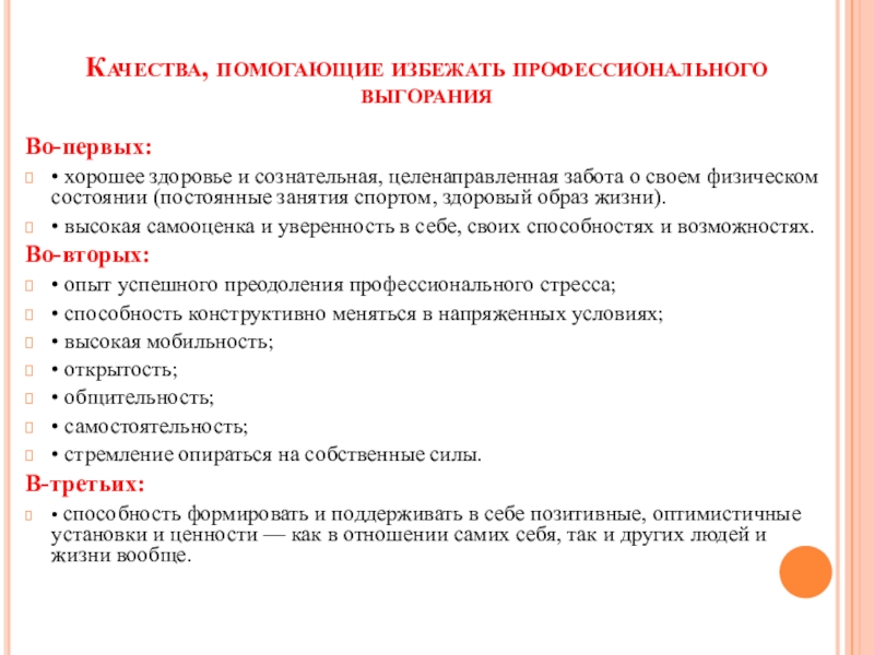 Слайд 14Качества, помогающие избежать профессионального выгорания