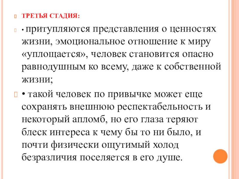 • притупляются представления о ценностях жизни, эмоциональное отношение к миру
