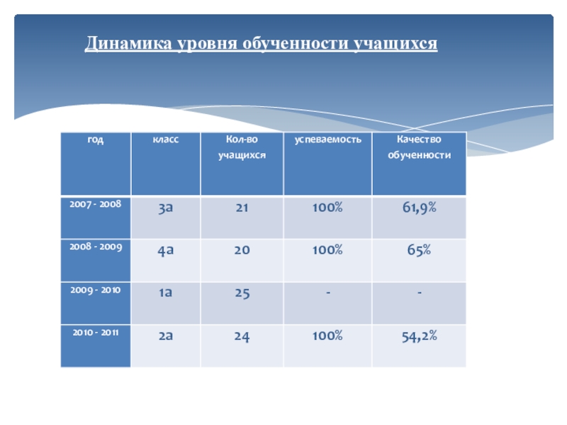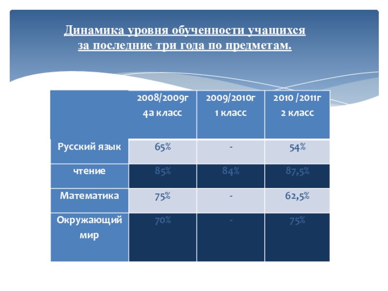 Слайд 23Динамика уровня обученности учащихся за последние три года по предметам.