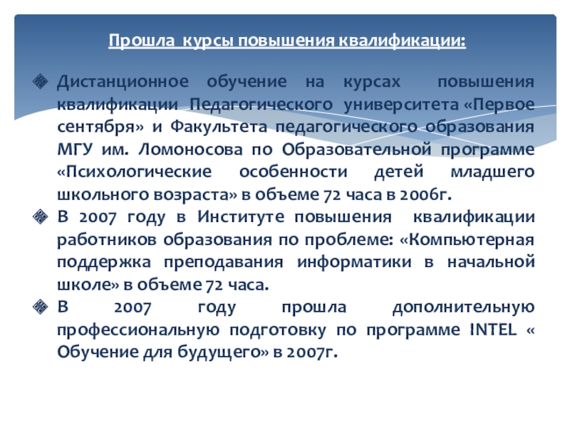 В 2007 году прошла дополнительную профессиональную подготовку по программе INTEL « Обучение для будущего» в 2007г.