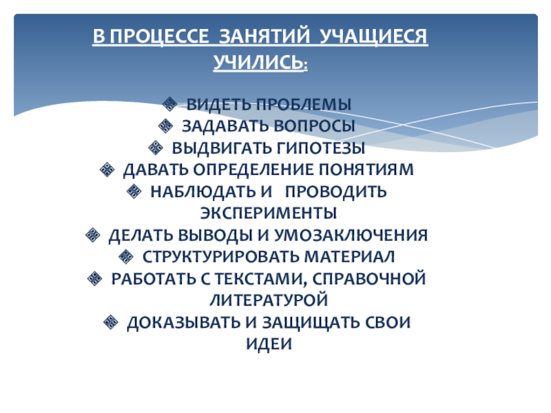 2. Развивать у учащихся умения пользоваться исследовательскими методами: сбора необходимой информации, фактов, умения их анализировать; выдвигать гипотезы, делать выводы и заключения.