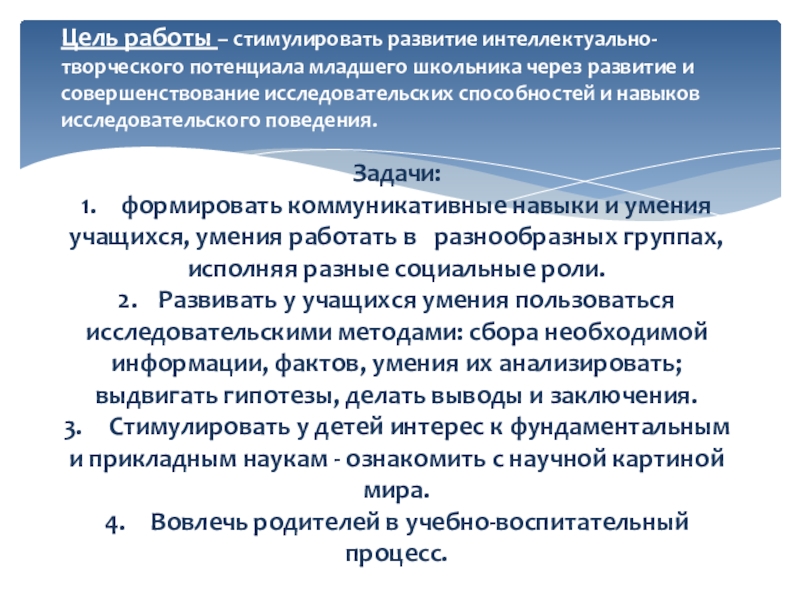 Слайд 5Цель работы – стимулировать развитие интеллектуально-творческого потенциала младшего школьника через развитие