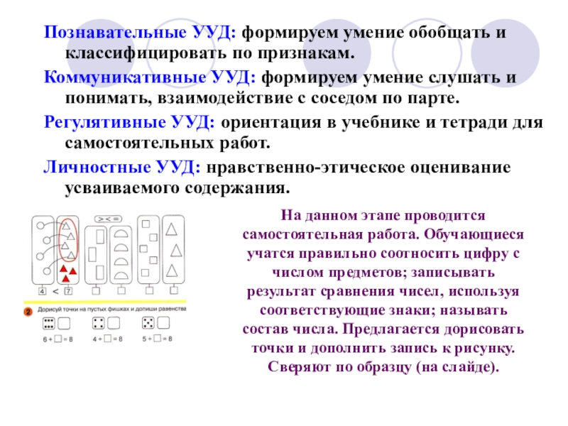 На данном этапе проводится самостоятельная работа. Обучающиеся учатся правильно соотносить цифру с числом предметов; записывать результат сравнения чисел, используя соответствующие знаки; называть состав числа. Предлагается дорисовать точки и дополнить запись к рисунку. Сверяют по образцу (на слайде).
