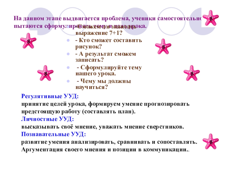 Регулятивные УУД: выполнение пробного учебного действия – поиска цифры 8, использовать математическую терминологию. Выполнение действий по заданному алгоритму.
