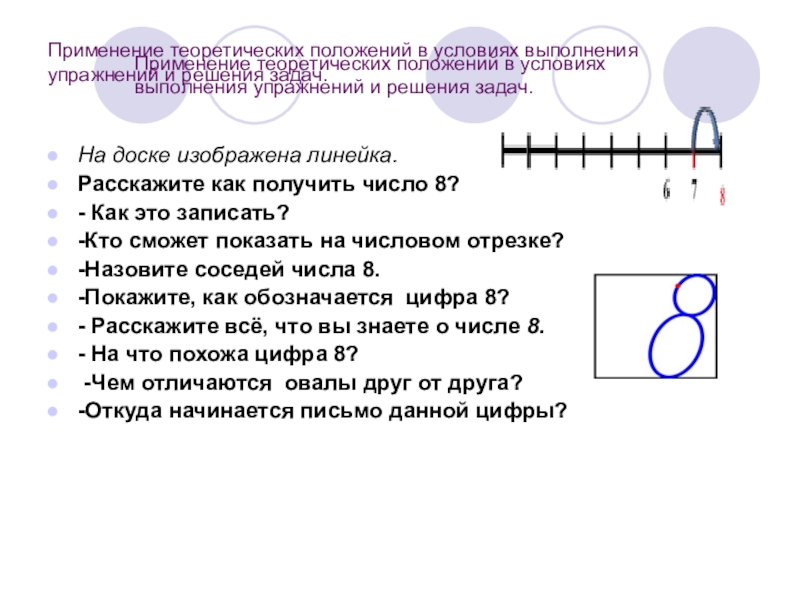под понятие цифры и числа 8, умение выполнять по образцу, умение выразить свои мысли.