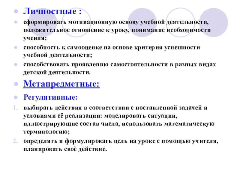 выбирать действия в соответствии с поставленной задачей и условиями её реализации: моделировать ситуации, иллюстрирующие состав числа, использовать математическую терминологию;