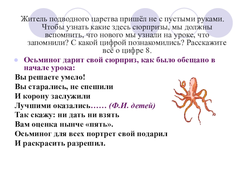 Осьминог дарит свой сюрприз, как было обещано в начале урока: