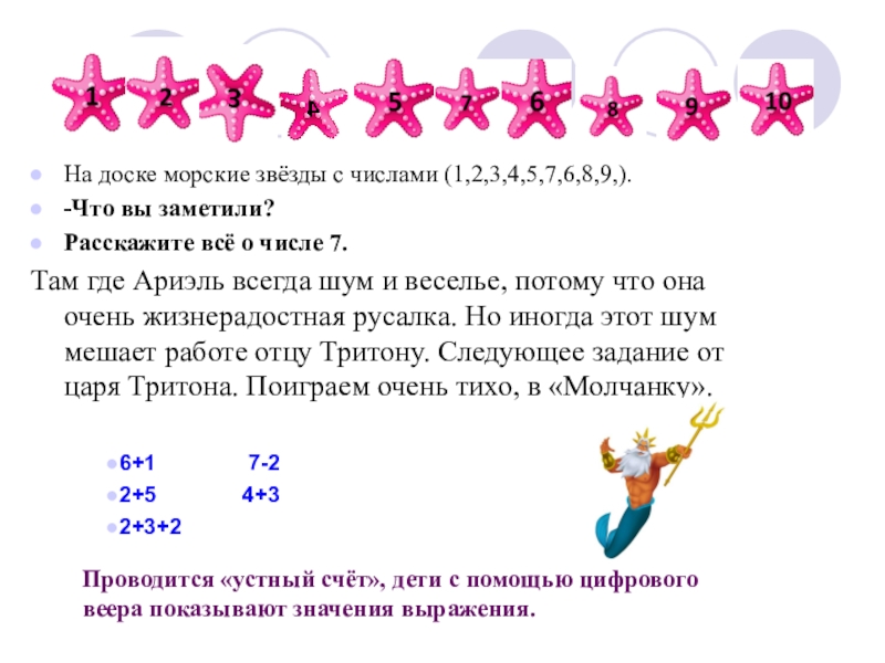 Слайд 12На доске морские звёзды с числами (1,2,3,4,5,7,6,8,9,).