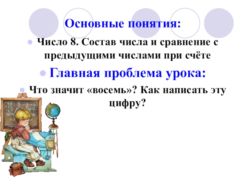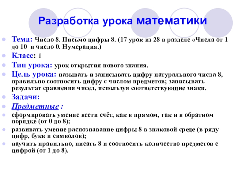 Цель урока: называть и записывать цифру натурального числа 8, правильно соотносить цифру с числом предметов; записывать результат сравнения чисел, используя соответствующие знаки.