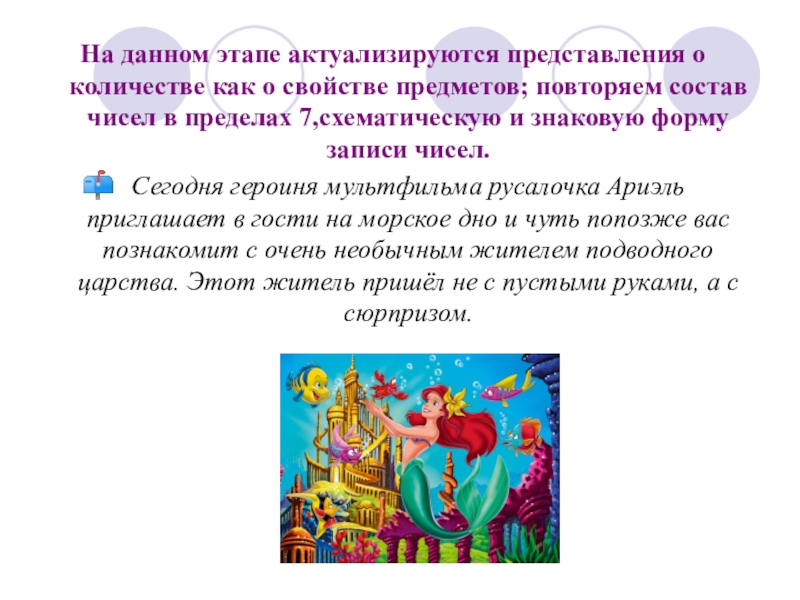 Сегодня героиня мультфильма русалочка Ариэль приглашает в гости на морское дно и чуть попозже вас познакомит с очень необычным жителем подводного царства. Этот житель пришёл не с пустыми руками, а с сюрпризом.