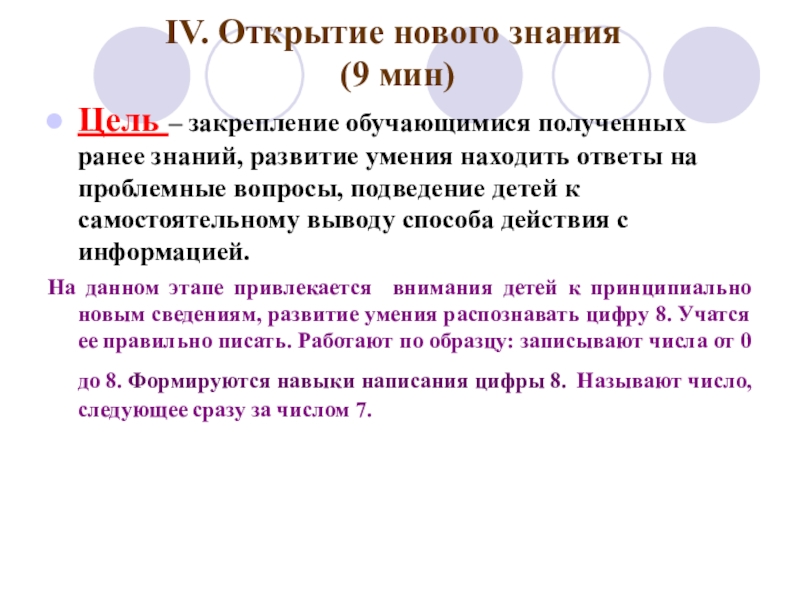 На данном этапе привлекается внимания детей к принципиально новым сведениям, развитие умения распознавать цифру 8. Учатся ее правильно писать. Работают по образцу: записывают числа от 0 до 8. Формируются навыки написания цифры 8. Называют число, следующее сразу за числом 7.