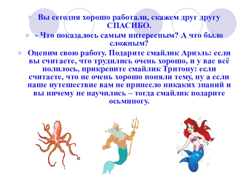 Оценим свою работу. Подарите смайлик Ариэль: если вы считаете, что трудились очень хорошо, и у вас всё полилось, прикрепите смайлик Тритону: если считаете, что не очень хорошо поняли тему, ну а если наше путешествие вам не принесло никаких знаний и вы ничему не научились – тогда смайлик подарите осьминогу.