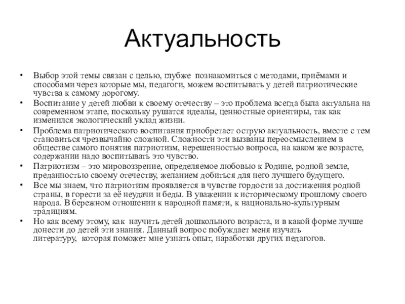 Проблема патриотического воспитания приобретает острую актуальность, вместе с тем становиться чрезвычайно сложной. Сложности эти вызваны переосмыслением в обществе самого понятия патриотизм, нерешенностью вопроса, на каком же возрасте, содержании надо воспитывать это чувство.