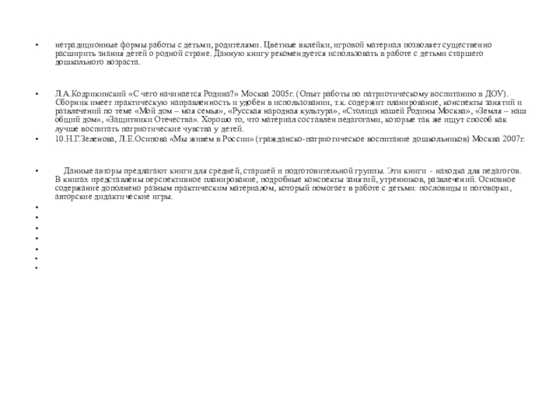 Л.А.Кодрикинский «С чего начинается Родина?» Москва 2005г. (Опыт работы по патриотическому воспитанию в ДОУ). Сборник имеет практическую направленность и удобен в использовании, т.к. содержит планирование, конспекты занятий и развлечений по теме «Мой дом – моя семья», «Русская народная культура», «Столица нашей Родины Москва», «Земля – наш общий дом», «Защитники Отечества». Хорошо то, что материал составлен педагогами, которые так же ищут способ как лучше воспитать патриотические чувства у детей.