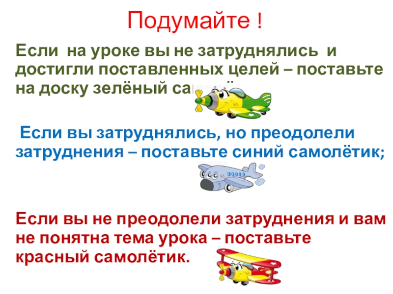 Если вы не преодолели затруднения и вам не понятна тема урока – поставьте красный самолётик.