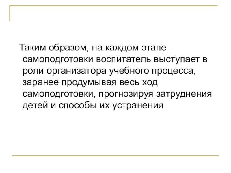 Слайд 14 Таким образом, на каждом этапе самоподготовки воспитатель выступает в роли