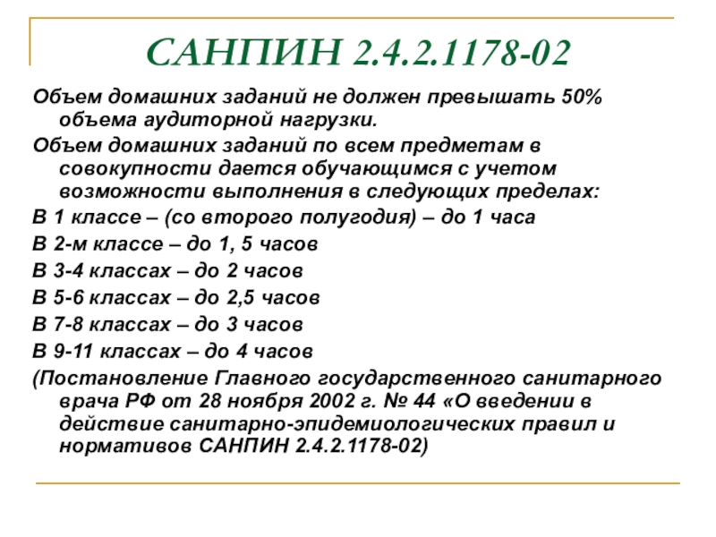 (Постановление Главного государственного санитарного врача РФ от 28 ноября 2002 г. № 44 «О введении в действие санитарно-эпидемиологических правил и нормативов САНПИН 2.4.2.1178-02)