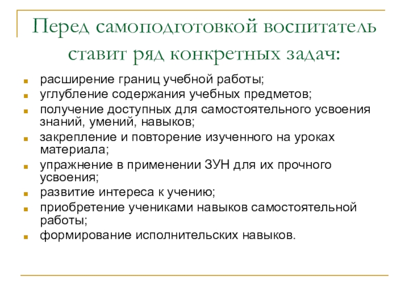 Слайд 6Перед самоподготовкой воспитатель ставит ряд конкретных задач: