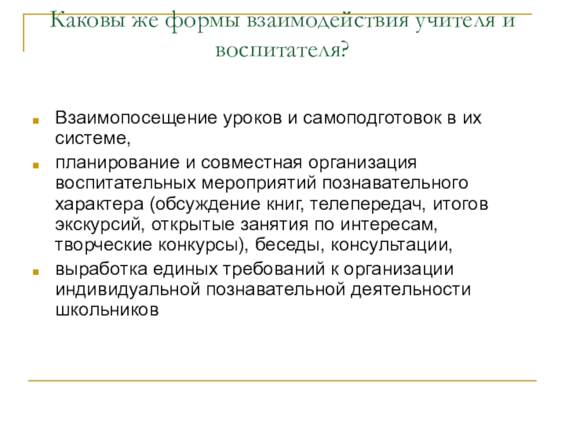 Слайд 12Каковы же формы взаимодействия учителя и воспитателя?