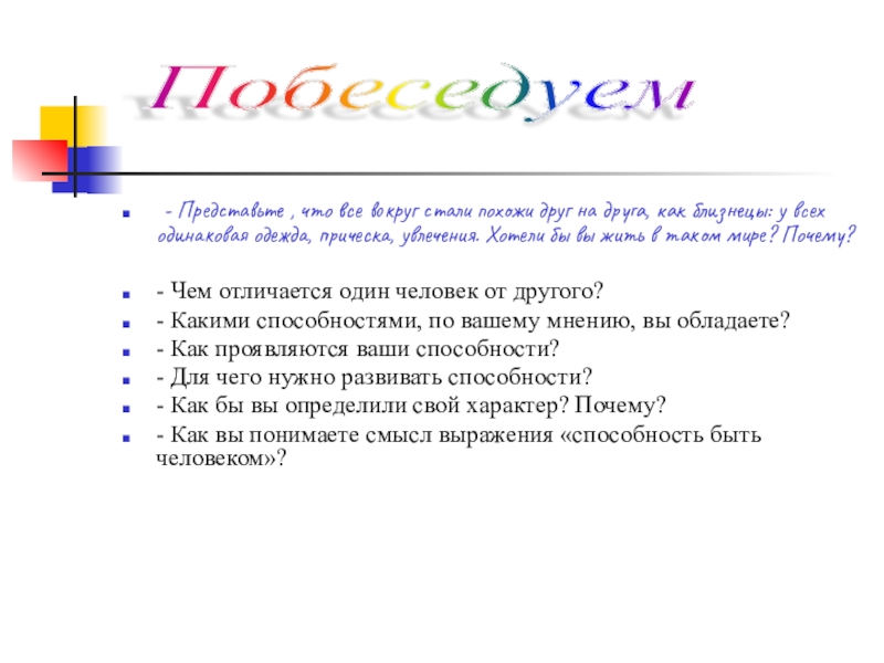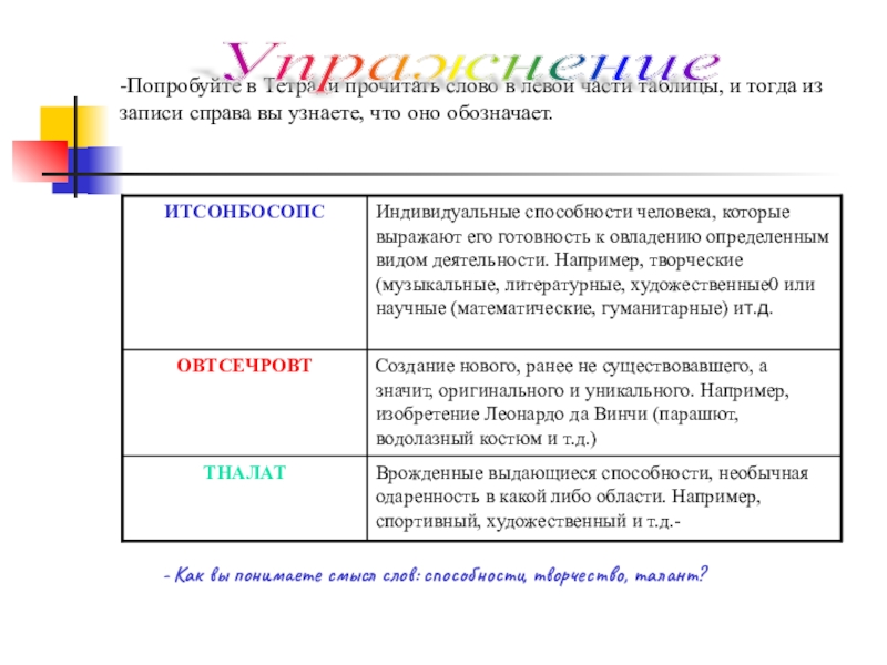 - Как вы понимаете смысл слов: способности, творчество, талант?